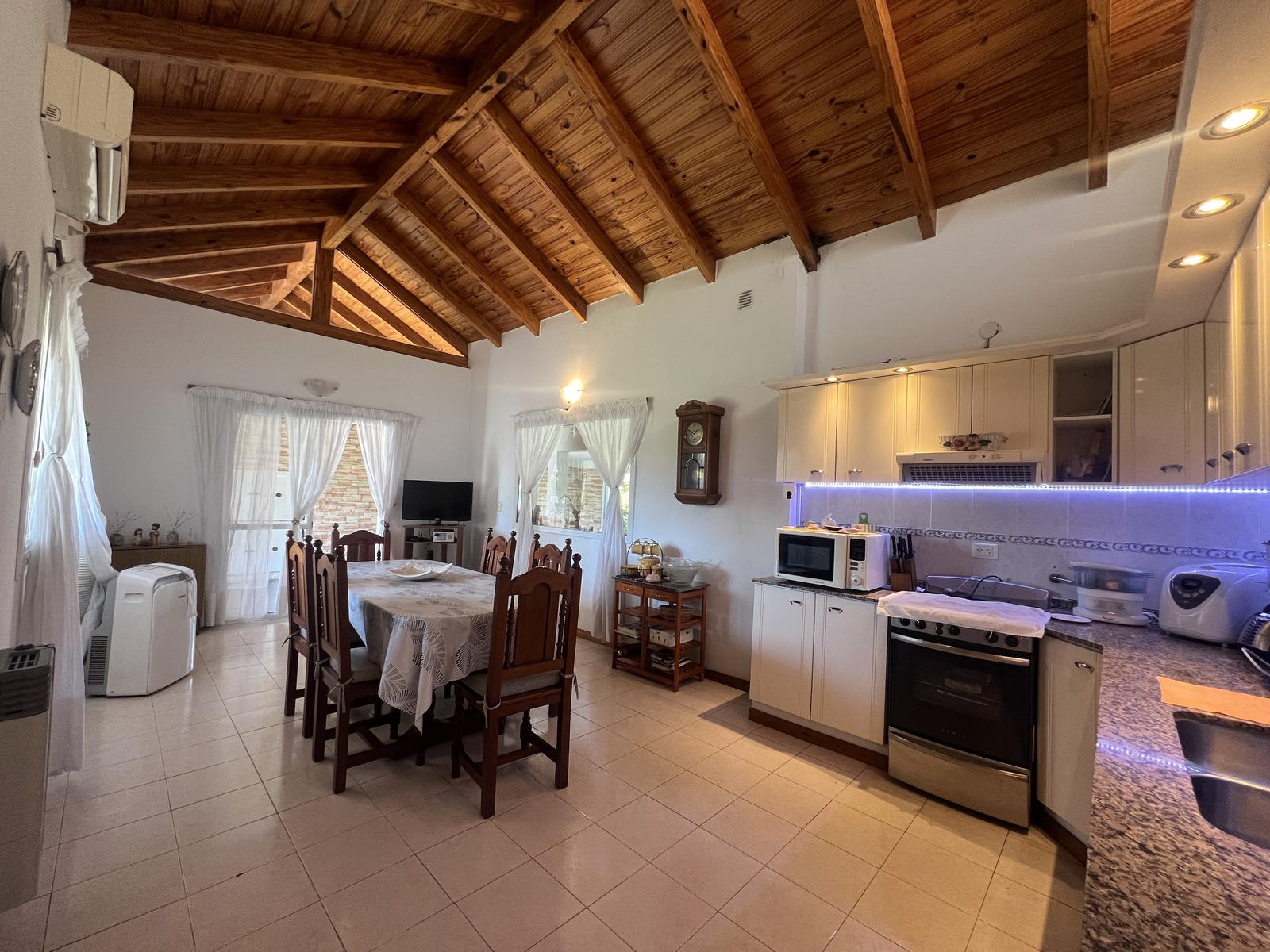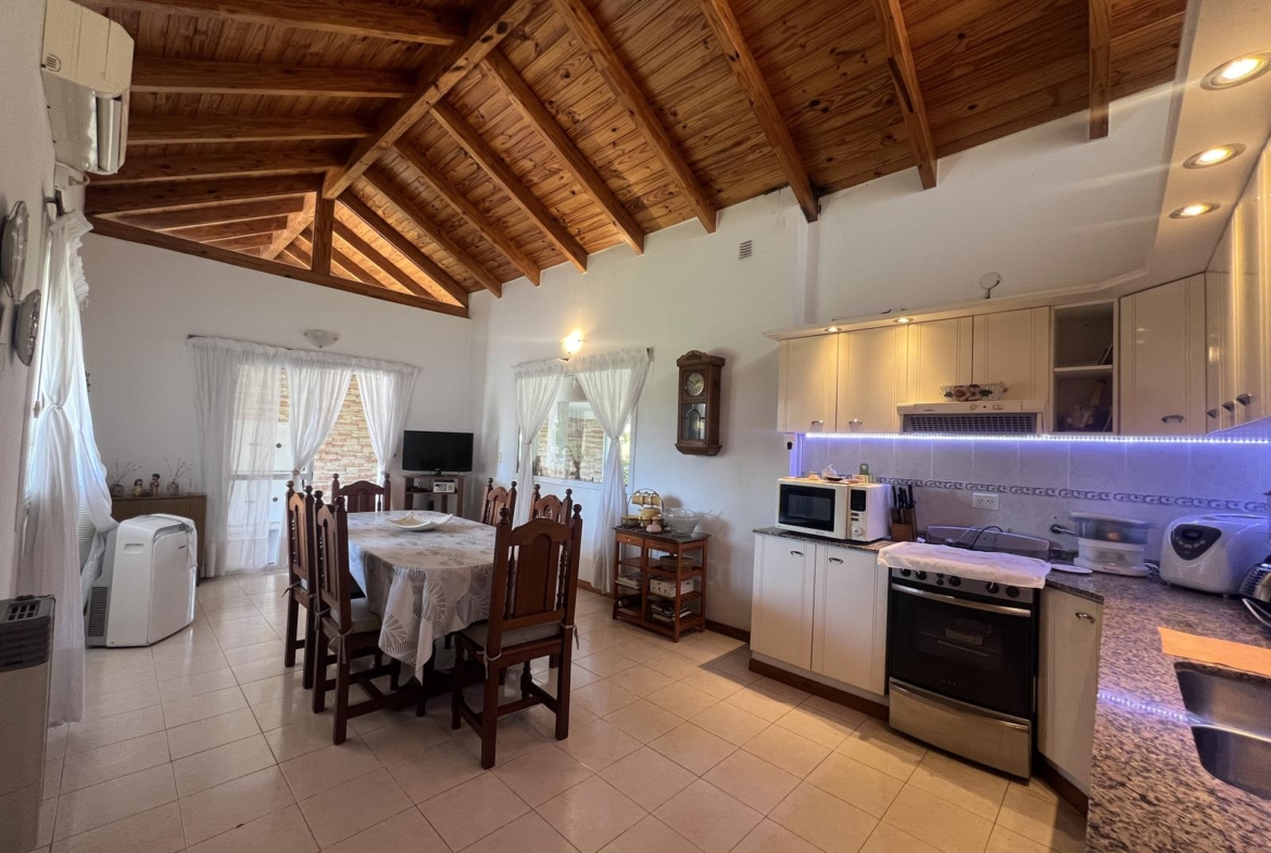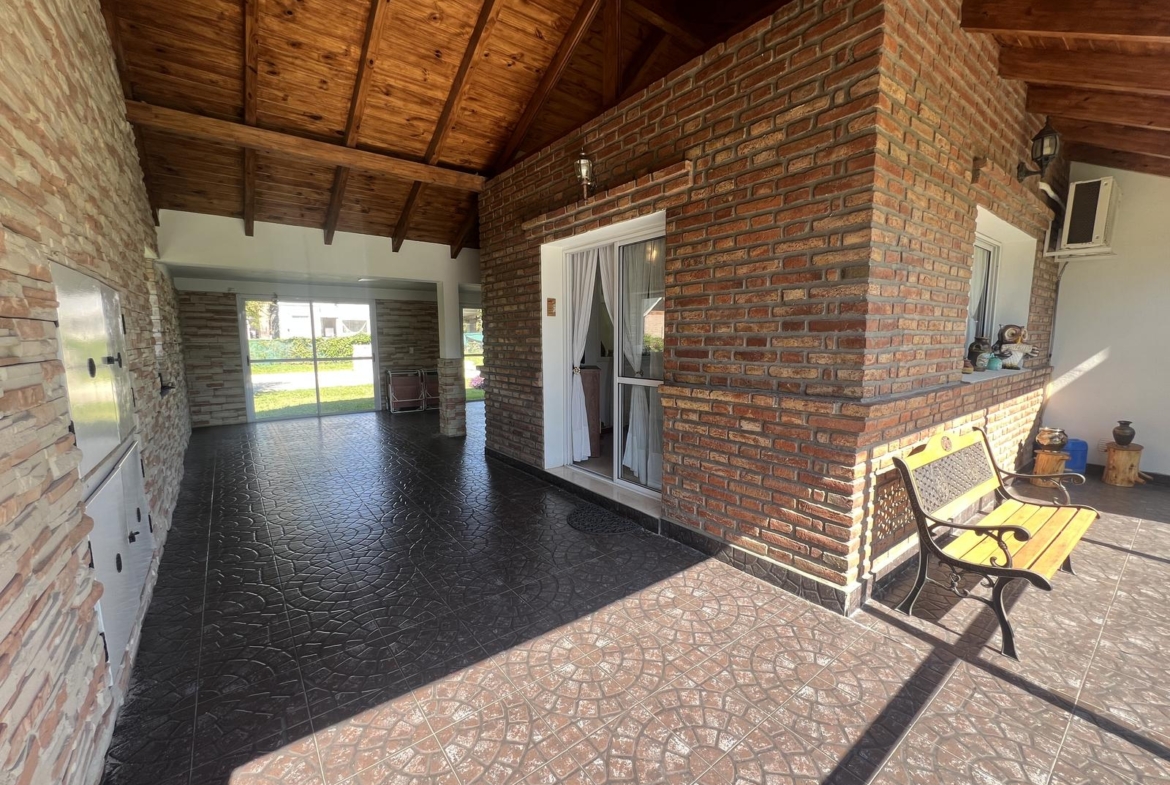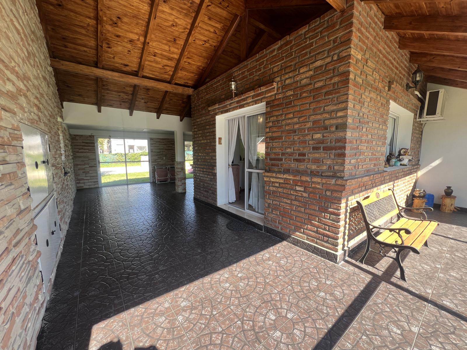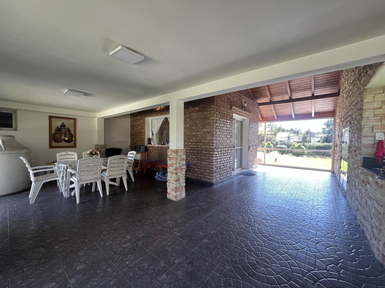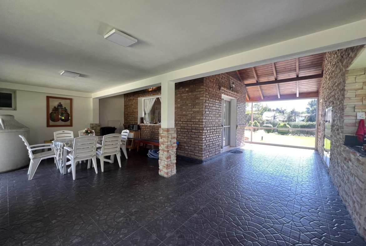 Gran galería/quincho con asador integrada a cochera cubierta para 3 vehículos.