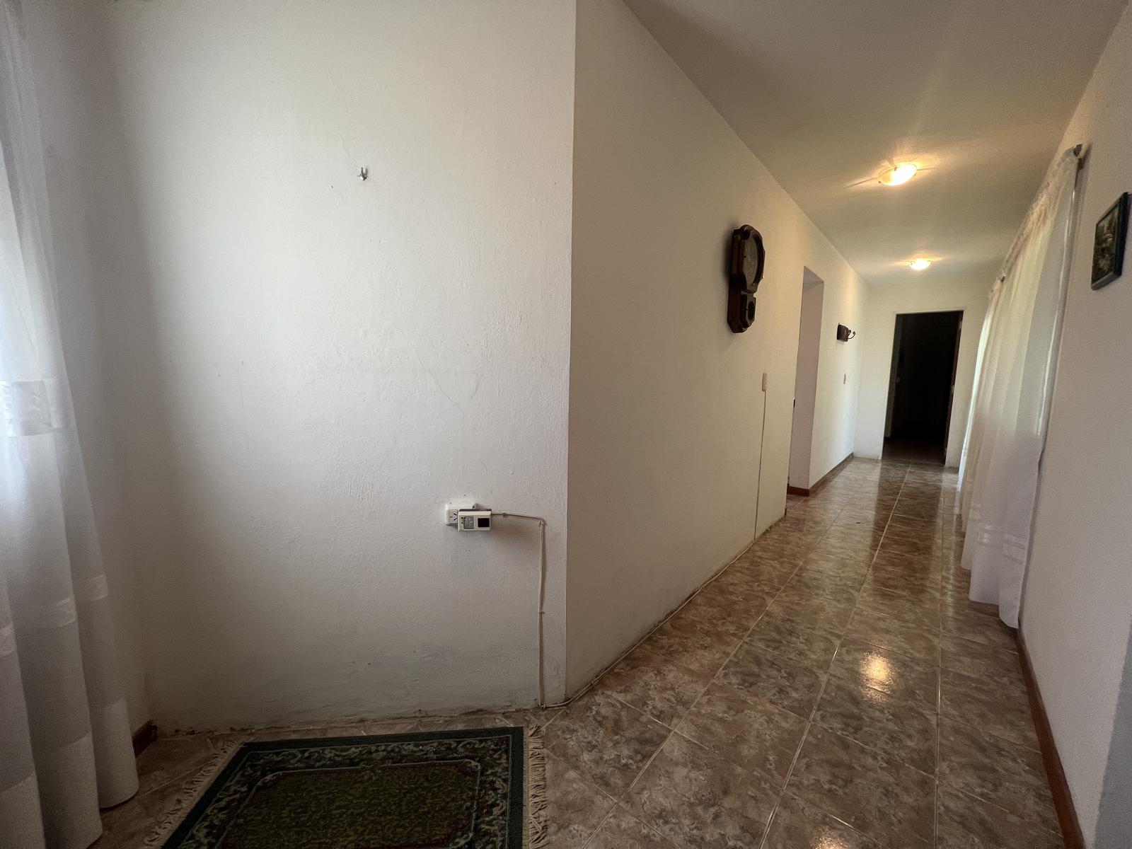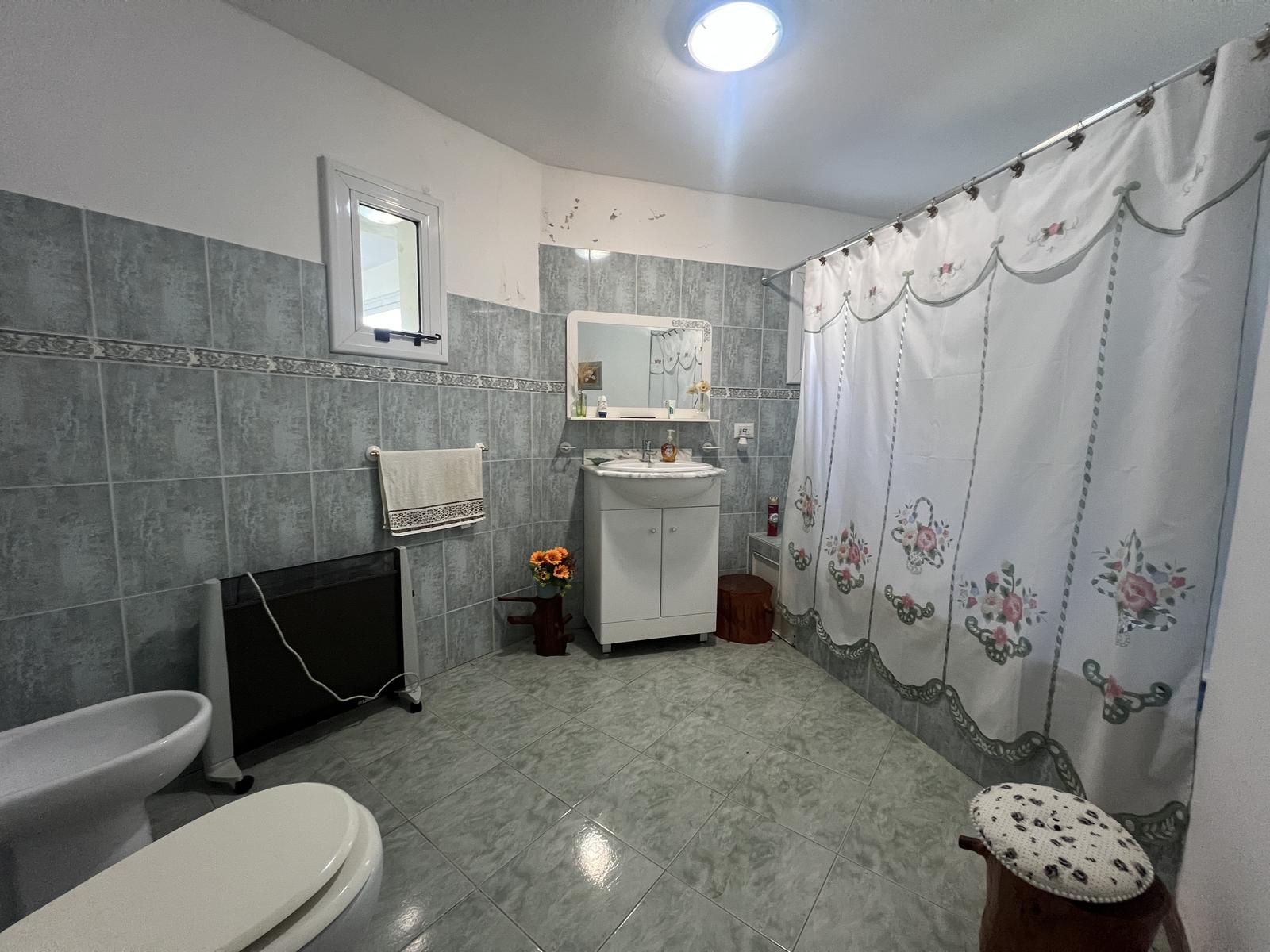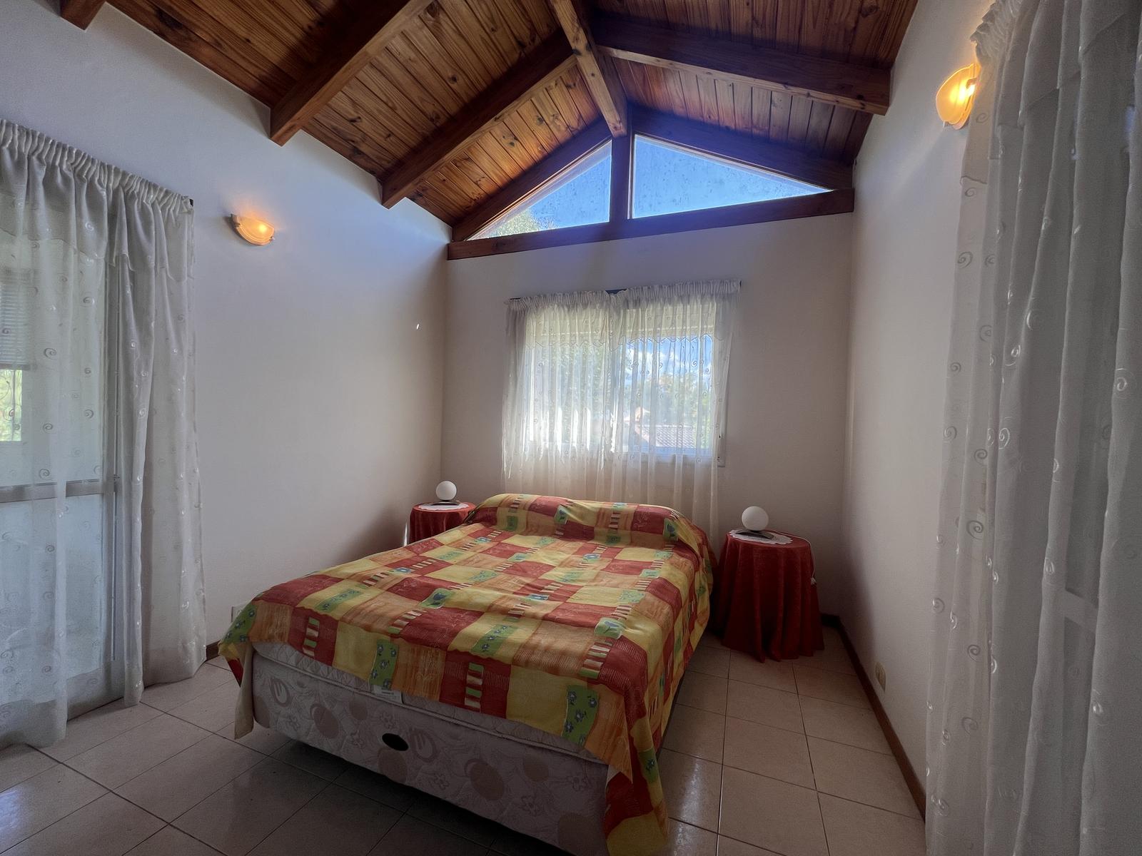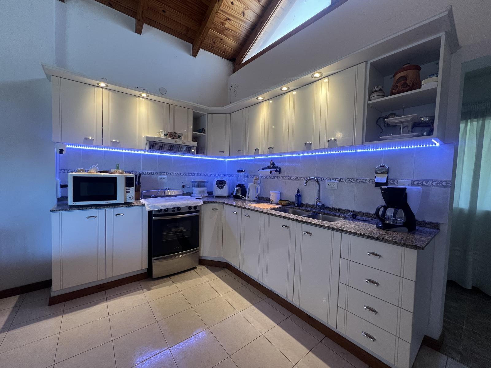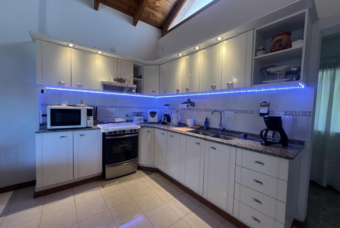 Gran galería/quincho con asador integrada a cochera cubierta para 3 vehículos.