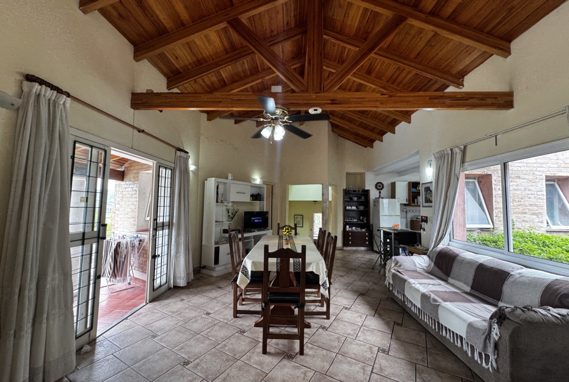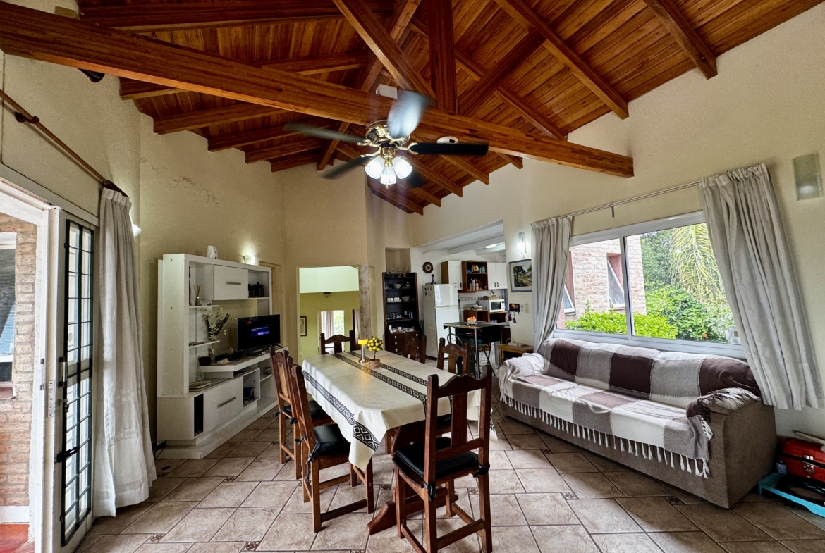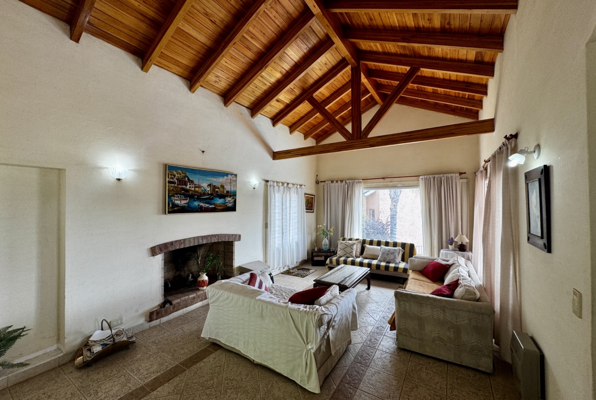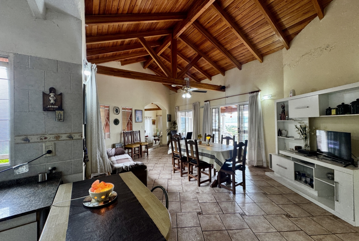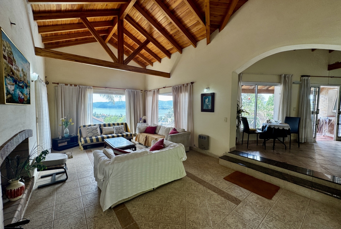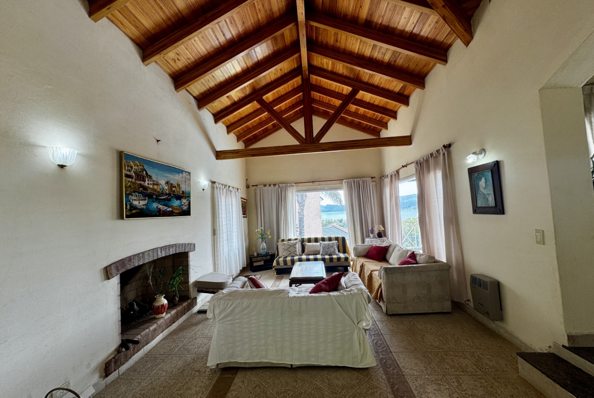 Desarrollada sobre un lote de 700 m², cuenta con 250 m² cubiertos, living comedor con techos altos de madera y hogar a leña, cocina totalmente equipada con alacenas y bajo mesada, 2 dormitorios (principal en suite con balcón), 2 baños completos, galería techada con vista al lago, pileta, parrilla y cochera cubierta para 2/3 vehículos.