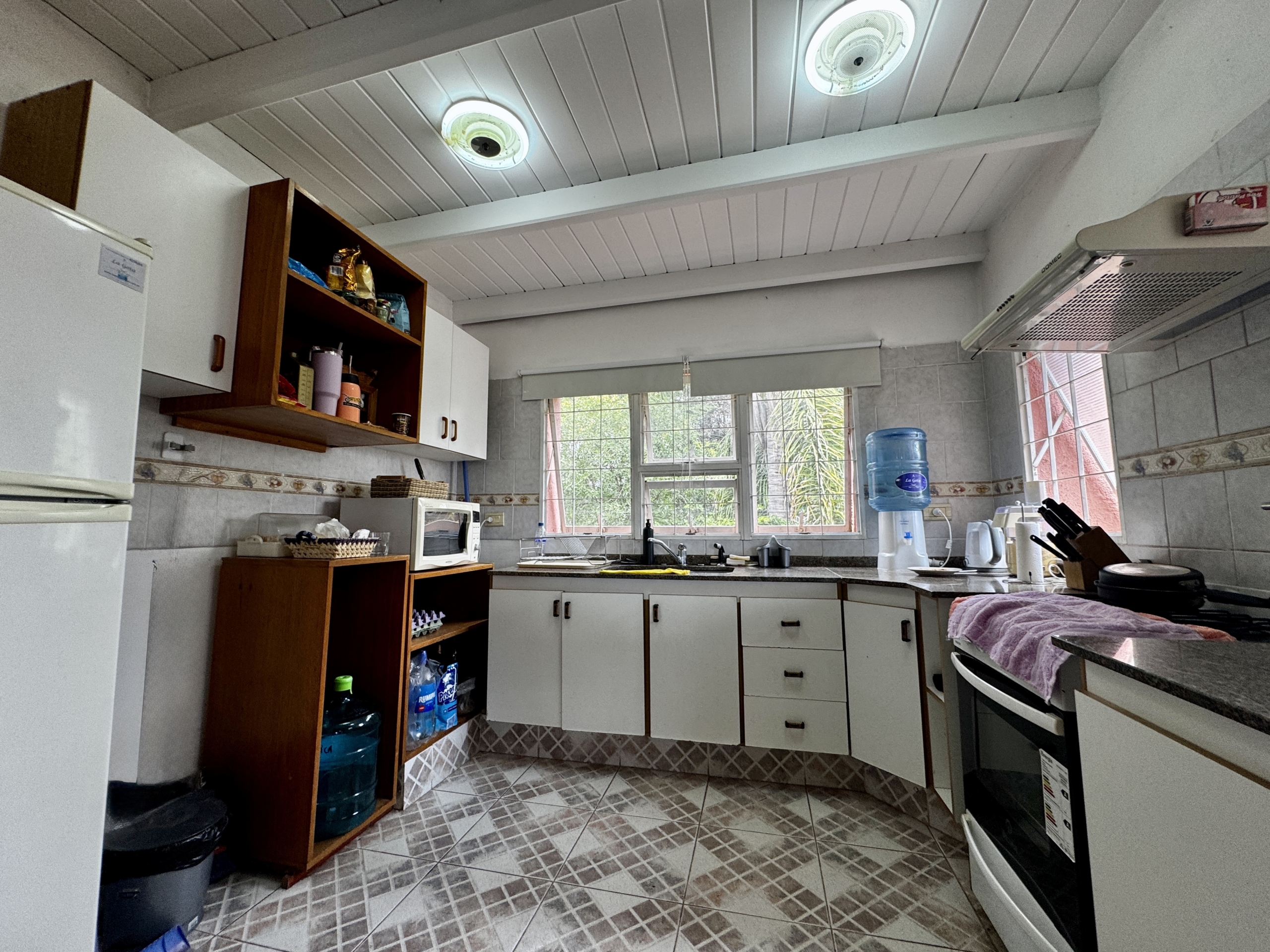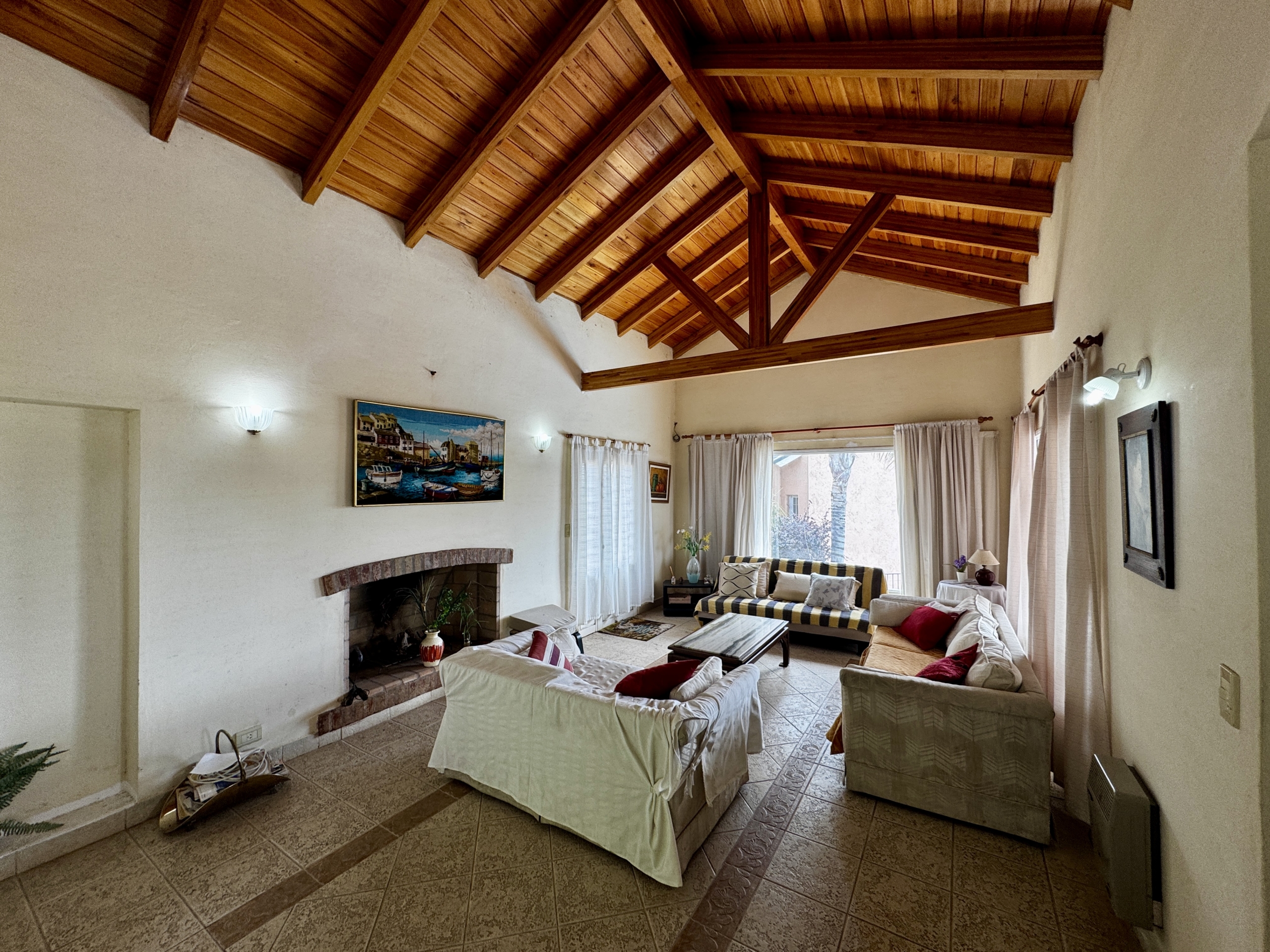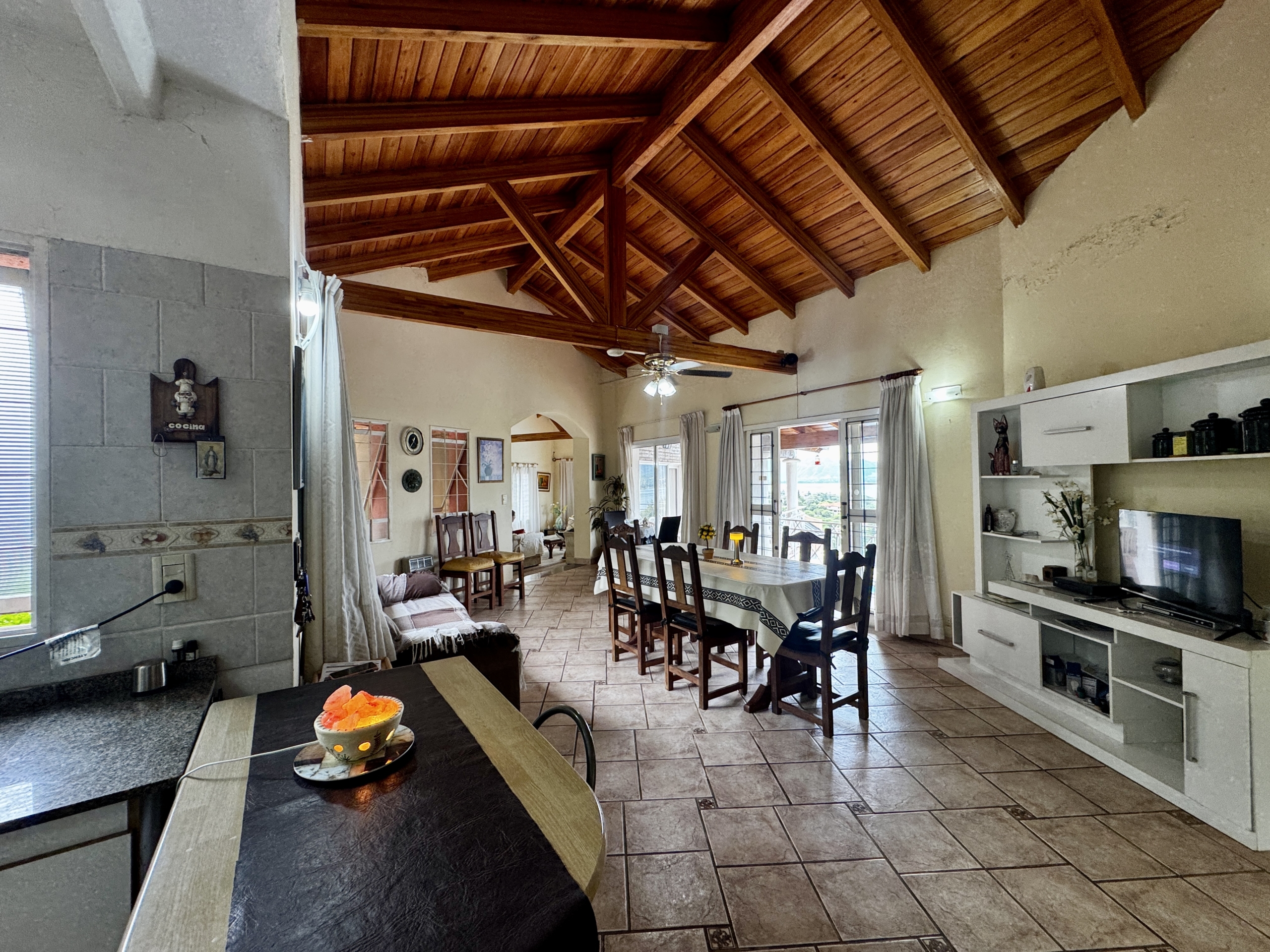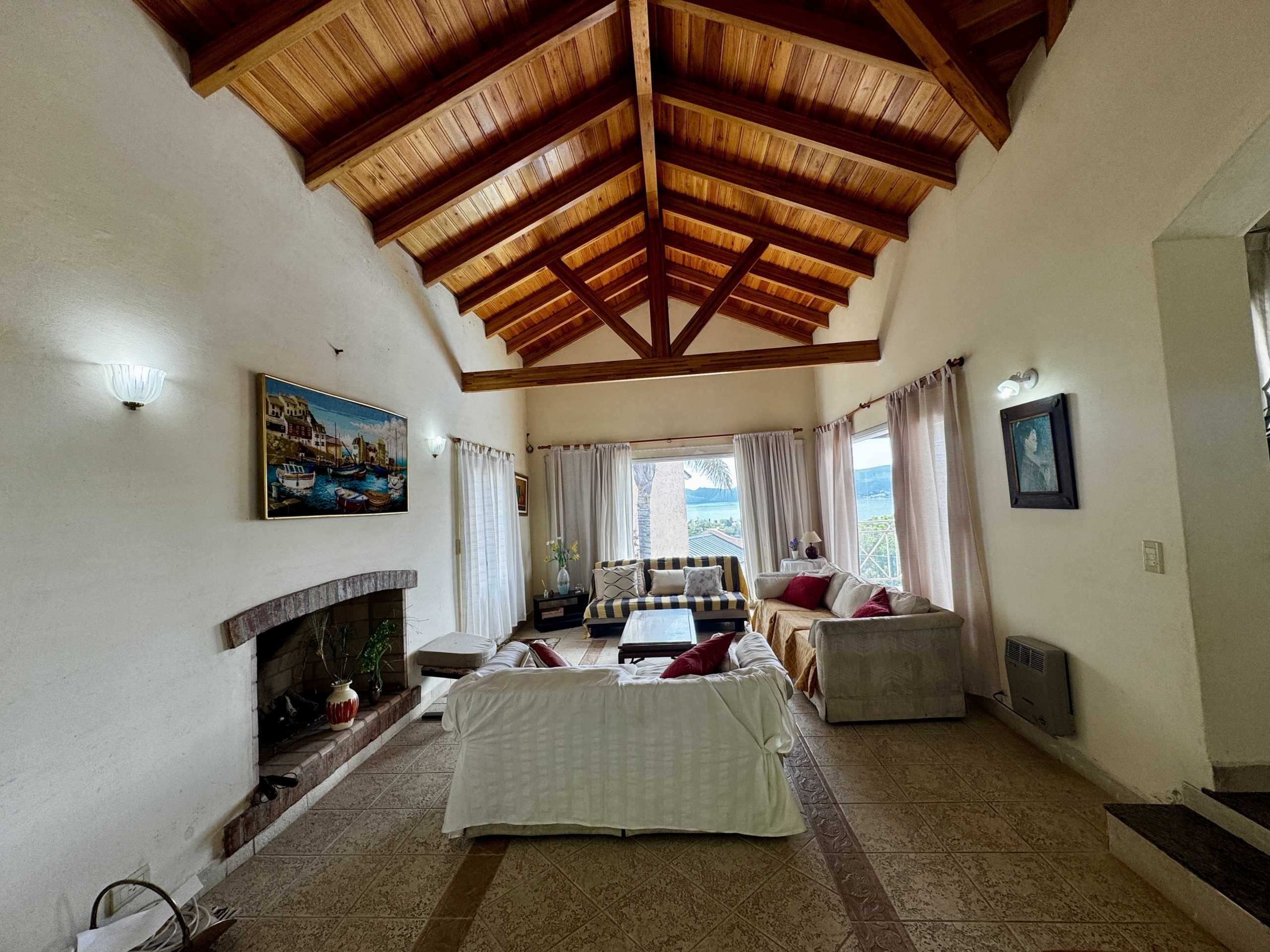 Desarrollada sobre un lote de 700 m², cuenta con 250 m² cubiertos, living comedor con techos altos de madera y hogar a leña, cocina totalmente equipada con alacenas y bajo mesada, 2 dormitorios (principal en suite con balcón), 2 baños completos, galería techada con vista al lago, pileta, parrilla y cochera cubierta para 2/3 vehículos.
